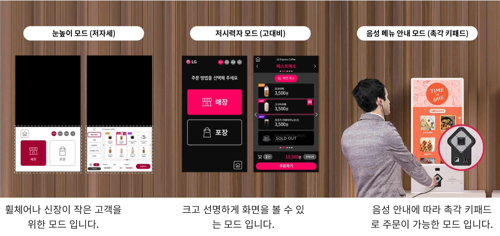 누구나 편리하게 사용이 가능하도록 눈높이 모드, 저시력자 모드, 음성 메뉴 안내 모드를 제공합니다.