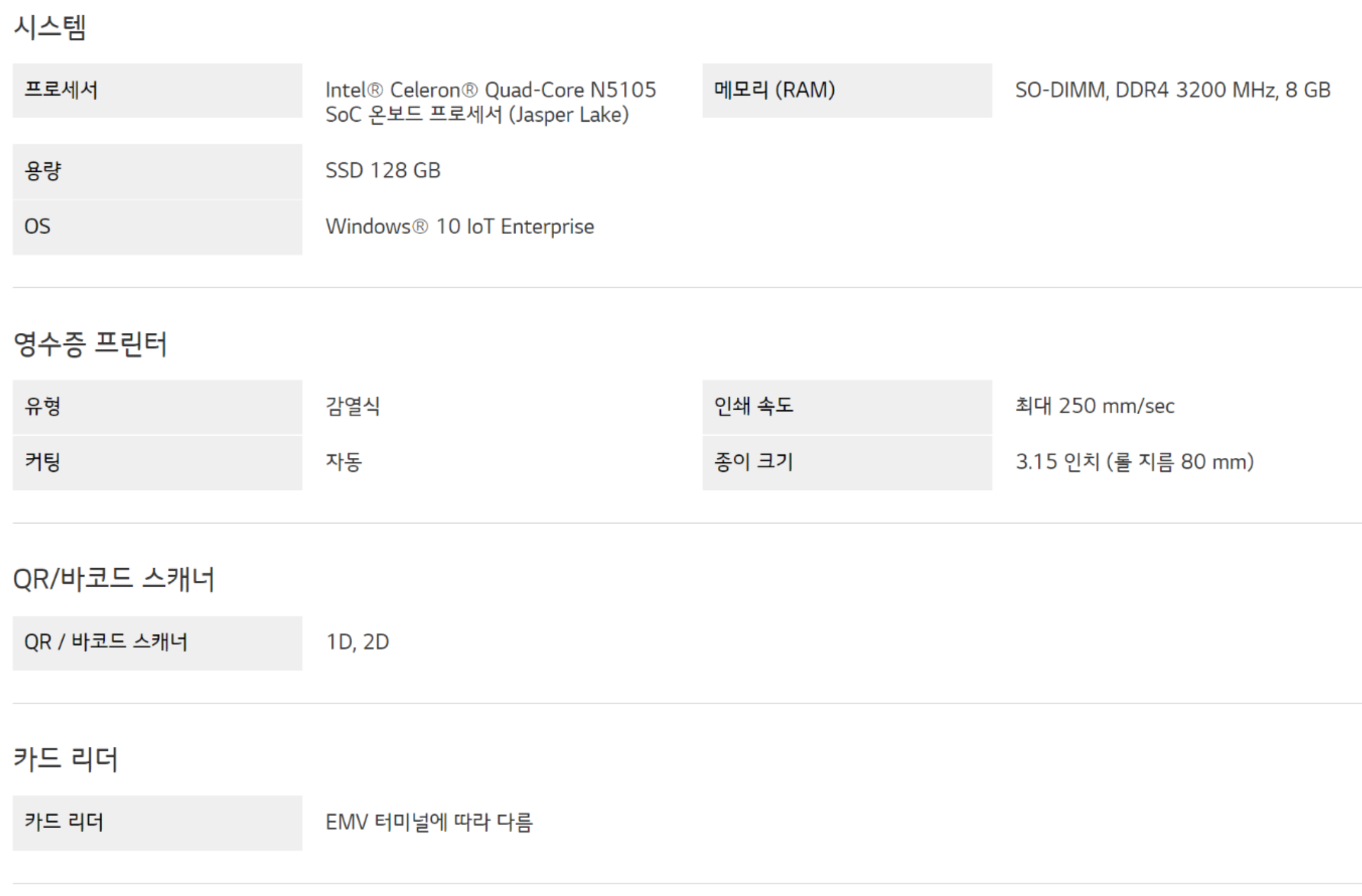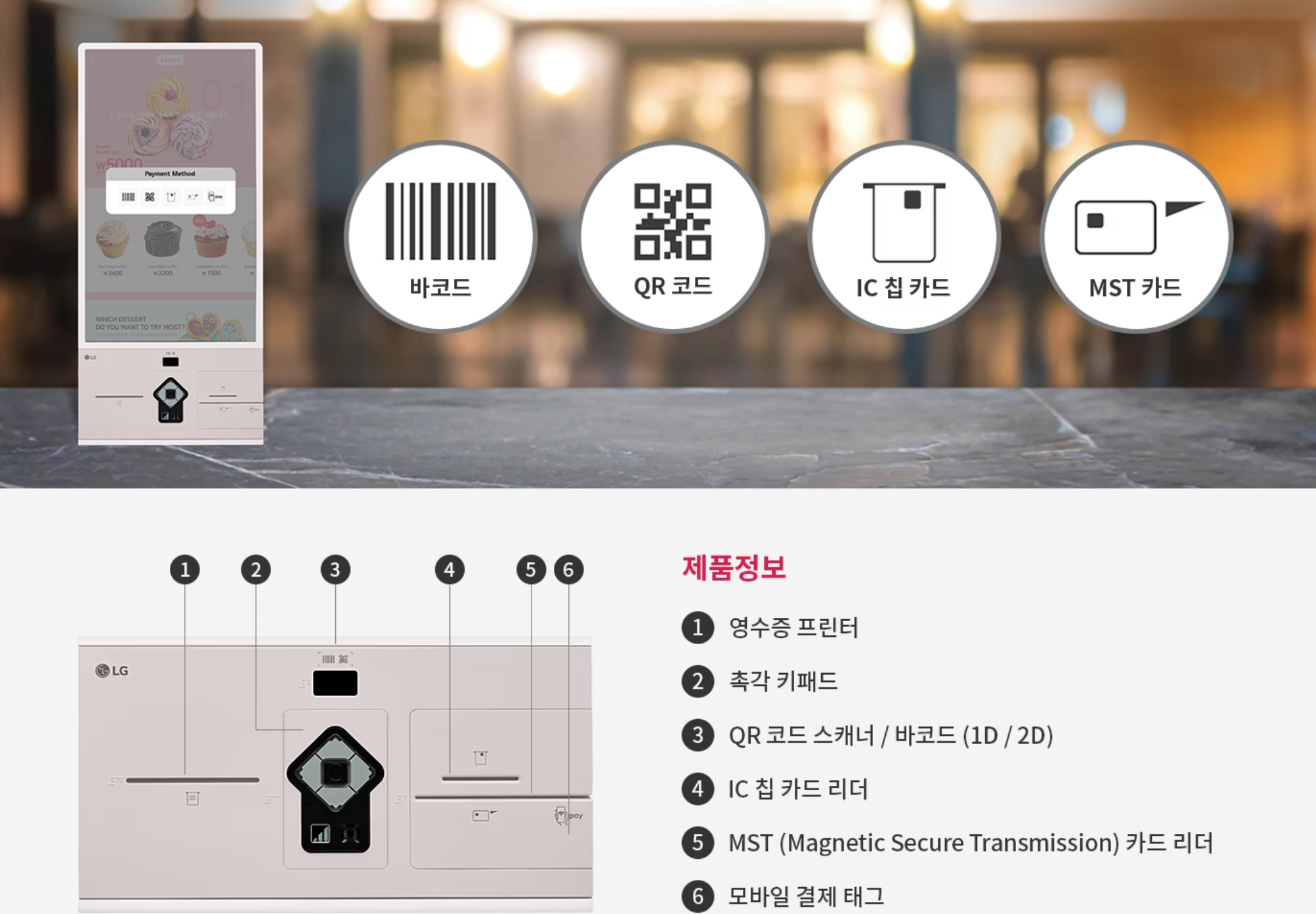 IC / MST 카드, 바코드, QR 코드 등 결제 방식을 지원하며 내장된 프린터를 통해 영수증도 쉽게 출력할 수 있습니다.